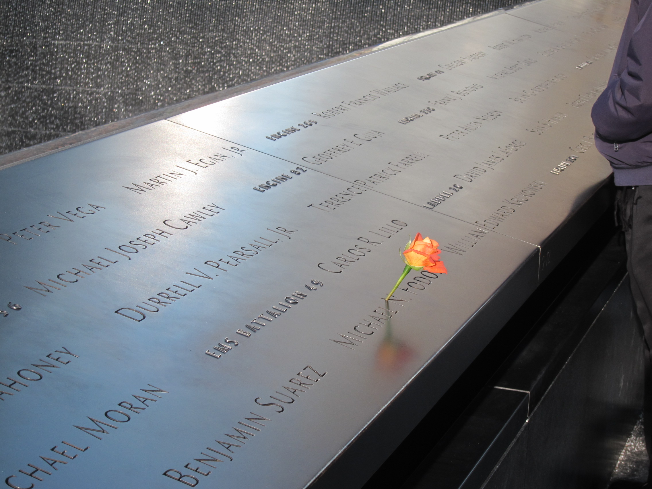 A flower left on the name of someone that was lost on 9/11 at the memorial fountains.