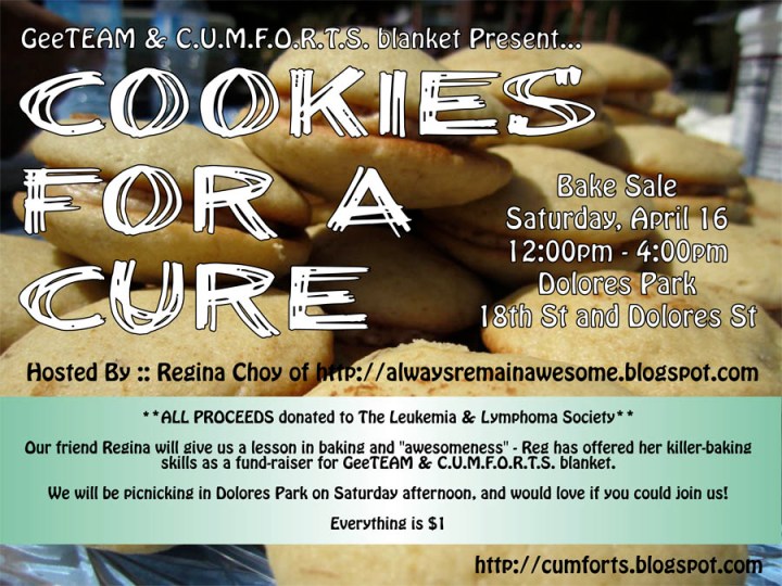 This Saturday my good friend Regina is teaming up with Jessica to host a bake sale. Regina is a foodie and loves to bake so she is donating her time and delicious delights to help raise money for C.U.M.F.O.R.T.S. blanket. Both Jessica and Regina will be at Dolores Park in San Francisco this Saturday from 12pm-4pm. All items will be $1 and ALL PROCEEDS will be donated. So if you’re free, come out to enjoy a day in the park with delicious treats and help contribute for a good cause!